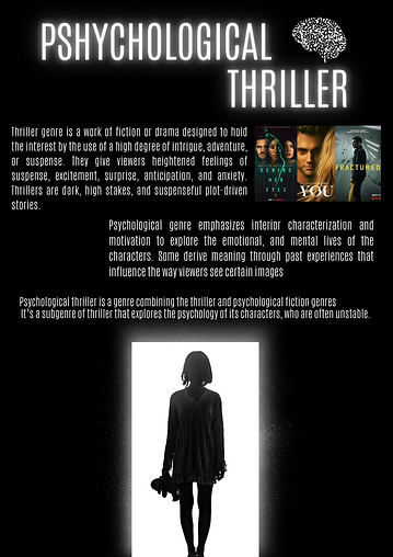 Psychological Thriller is the major genre that I want my opening sequence to run along since I find this type of film really intriguing and appealing. Psychological thrillers often hit the audience’s psyche by thrilling details which will be more haunting and tense compared to the general thriller. This may be one of the crucial elements that made me obsessed with this film genre. Besides that, while watching a film, I like to have a feeling of suspense and fear therefore others such as romantic drama may not be the best fit for me.